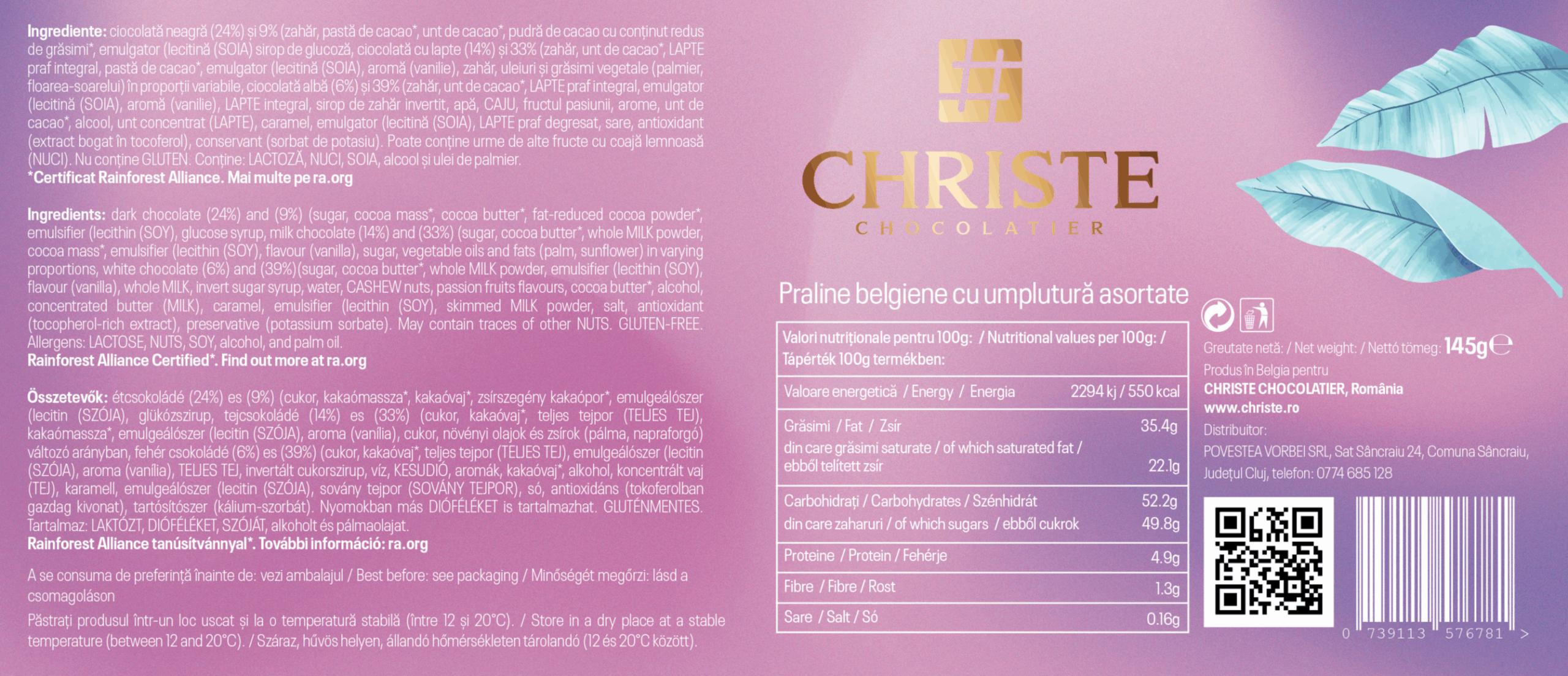 Cutie 25 praline ciocolată belgiană Asortiment - Colecția Flori de Dragoste (345g)