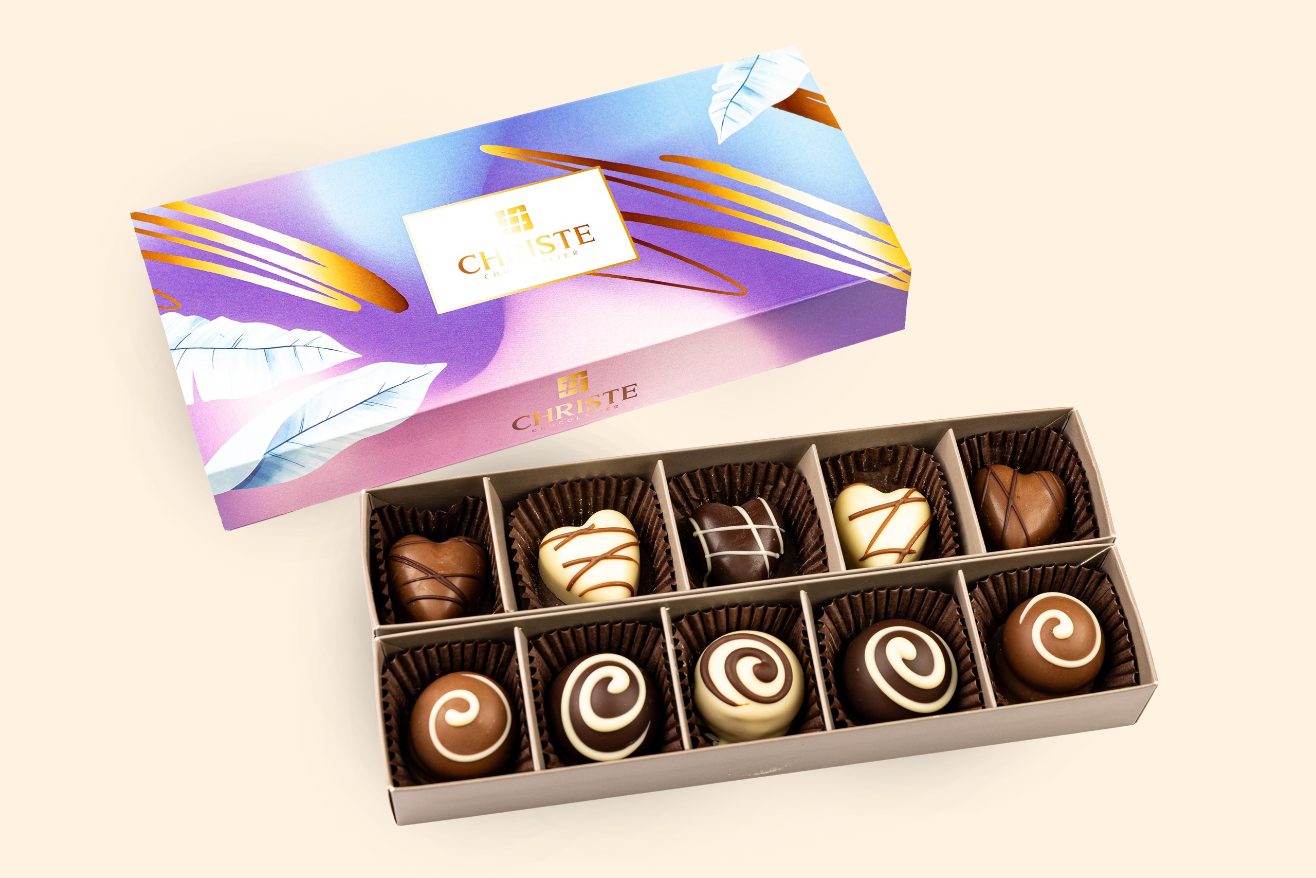 Cutie 10 praline ciocolată belgiană – Duo Lila & Blue (145g) – Sandbox Cutie 10 praline ciocolată belgiană – Duo Lila & Blue (145g) – Sandbox